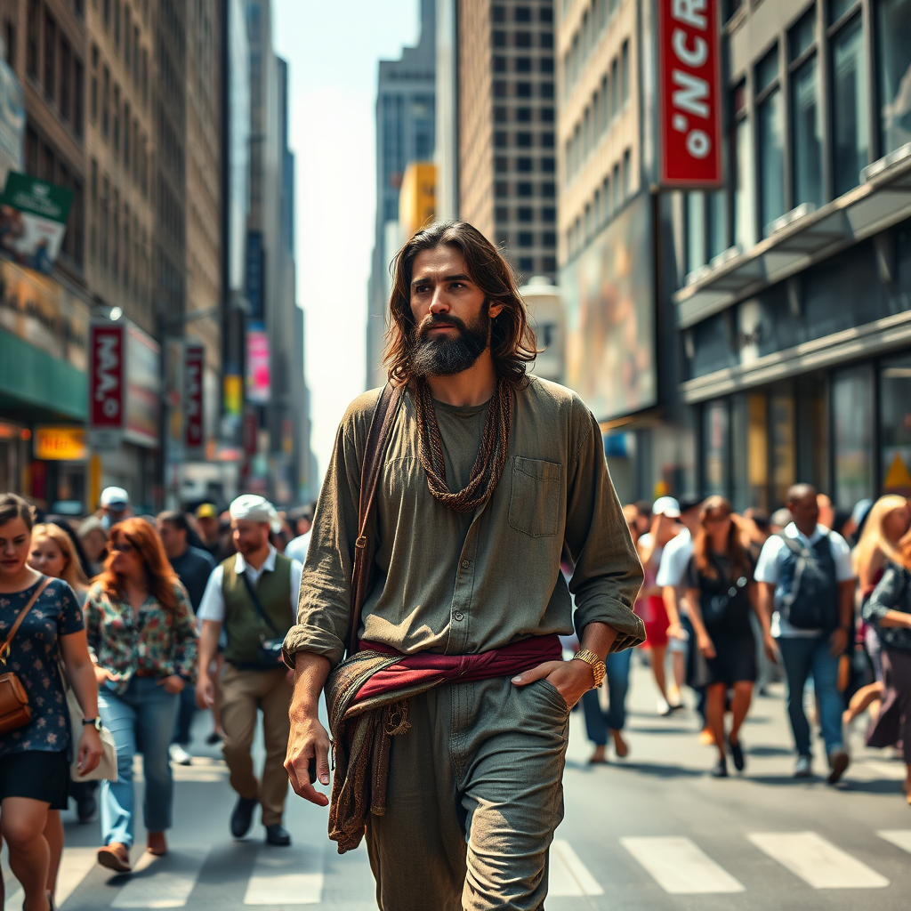Jesus, in bohemian attire, casually strolling through bustling New York City streets, blending seamlessly with the diverse crowd around him, a cinematic and ultraphotorealistic scene captured in vivid HDR, 8k resolution, showcasing the vibrant energy and unique characters of the city.