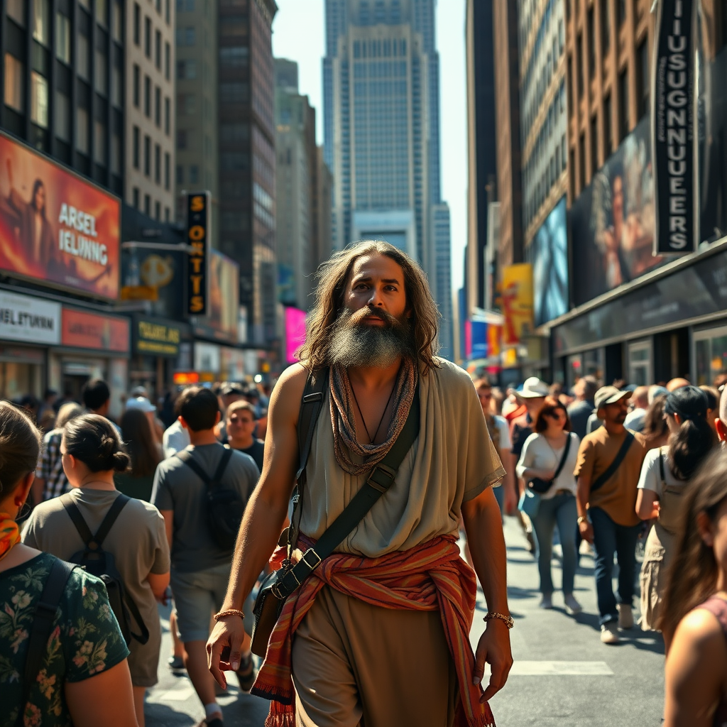 Jesus in bohemian attire wandering through the bustling streets of New York City, mingling with diverse crowds, the scene captured in cinematic detail, showcasing ultraphotorealism, vibrant HDR colors, and stunning 8k resolution, the urban backdrop lively and iconic skyscrapers towering above.