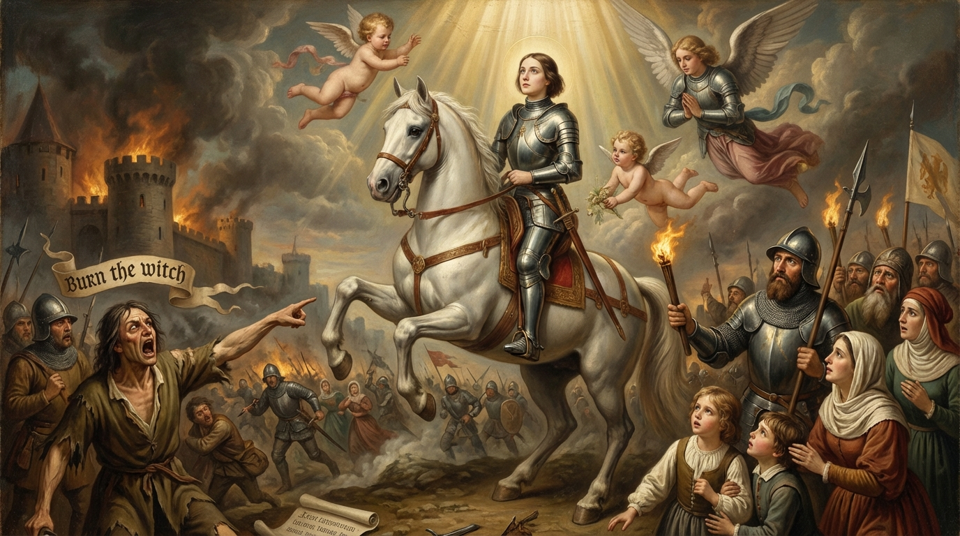 A dramatic Renaissance-style painting depicts Joan of Arc on horseback, surrounded by angels and a burning castle. The scene captures intense historical irony with a crowd divided between awe and fear, some calling for her burning.