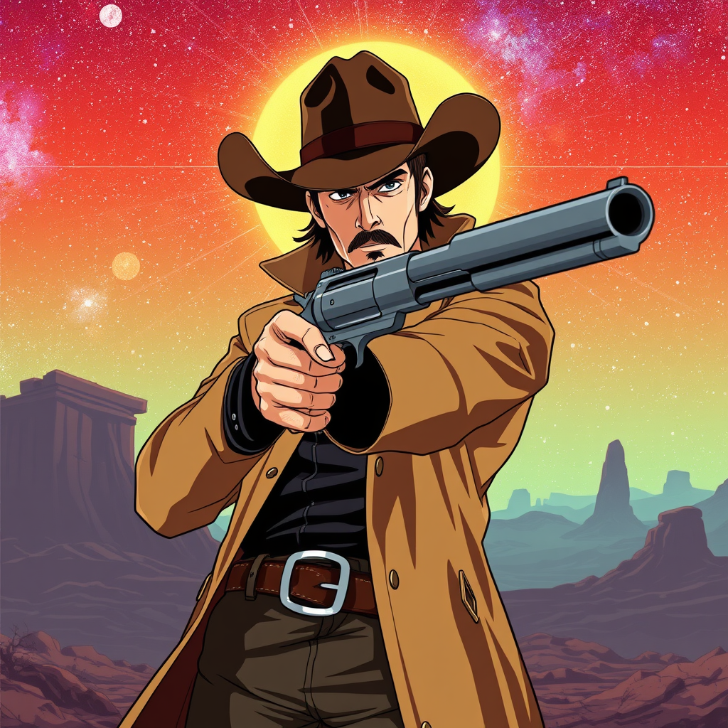 John Wayne anime space cowboy in a futuristic galaxy setting, blending classic Western elements with sci-fi aesthetics, wearing a rugged duster coat and cowboy hat, set against a backdrop of starry skies and alien landscapes, wielding a high-tech revolver with a confident stance, drawing inspiration from Cowboy Bebop and Trigun's space western themes, exuding a sense of adventure and rugged charm in a lawless universe.