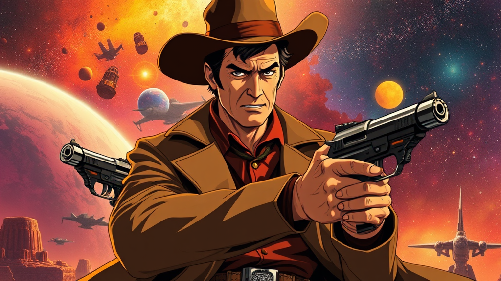 John Wayne as a charismatic anime space cowboy, blending the ruggedness of a classic Western hero with the sleek style of Cowboy Bebop and Trigun, set against a vibrant space western backdrop where frontier planets and futuristic towns merge seamlessly, featuring dual laser pistols, a long duster coat fluttering in zero gravity, and a determined gaze under a wide-brimmed hat, all amidst a backdrop of glowing nebulae and distant stars.