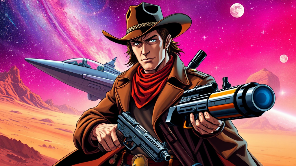 John Wayne as a rugged anime space cowboy, reminiscent of Cowboy Bebop and Trigun; dressed in a futuristic western attire with a worn leather duster and a high-tech cowboy hat, set against a backdrop of starlit galaxies and dusty asteroid plains. Blasters holstered at his sides and a rebellious, determined look in his eyes, he navigates through a vibrant, neon-tinted universe. His trusty spacecraft, a fusion of vintage design and advanced technology, hovers nearby, ready for intergalactic adventures in this iconic western sci-fi realm.