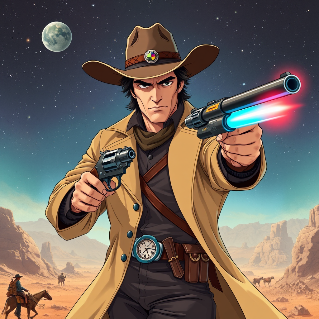 John Wayne as an anime-inspired space cowboy, blending the rugged charm of a classic Western hero with the sleek aesthetics of Cowboy Bebop and Trigun. Set against a backdrop of cosmic vistas, this character dons a wide-brimmed hat and a long, flowing duster coat with futuristic embellishments. He wields a plasma revolver, its barrel gleaming with neon accents, while navigating a world where dusty frontier landscapes merge with advanced technology. His steely gaze reflects both a deep sense of justice and the untamed spirit of the Wild West, as he strides through bustling interstellar hubs and lawless asteroid outposts.