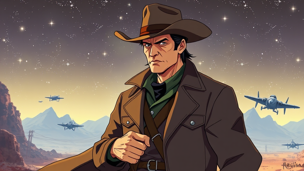 John Wayne as an anime space cowboy, blending the rugged charm of a classic Western gunslinger with the futuristic flair of Cowboy Bebop and Trigun, set against a backdrop of vast galaxies and barren alien landscapes, where starships replace horses and blaster duels hold justice; a stoic hero navigating lawless space towns, with a duster coat flowing like stardust, complemented by a cowboy hat that casts a long shadow under the glow of distant stars, all wrapped in a vibrant, animated style that captures the essence of a Western sci-fi saga.