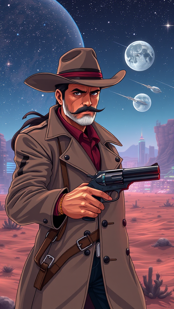 John Wayne as an anime space cowboy, set in a futuristic universe reminiscent of Cowboy Bebop or Trigun, blending classic Western elements with sleek sci-fi aesthetics. He wears a cybernetic hat and dusted trench coat, with a rugged charm and a laser revolver at his side, navigating bustling spaceports and desolate planets. Starry skies and neon cityscapes contrast with barren desert landscapes, capturing the essence of a space western adventure.