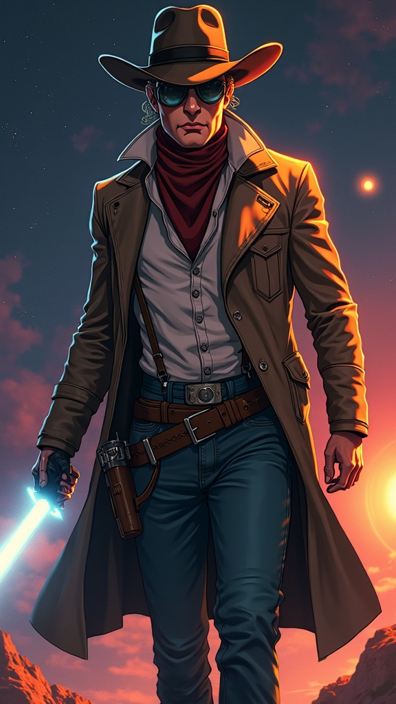 John Wayne reimagined as an anime space cowboy, blending the rugged charm of classic Westerns with the futuristic style of Cowboy Bebop and Trigun. He roams the galaxy, clad in a high-tech duster coat, wide-brimmed hat, and a pair of laser revolvers at his hip. His spaceship, an old but reliable star cruiser, symbolizes his adventurous spirit. Set against a backdrop of distant planets and neon-lit spaceports, he embodies the essence of a lone wanderer, seeking justice across the stars in a universe where the frontier never ends.