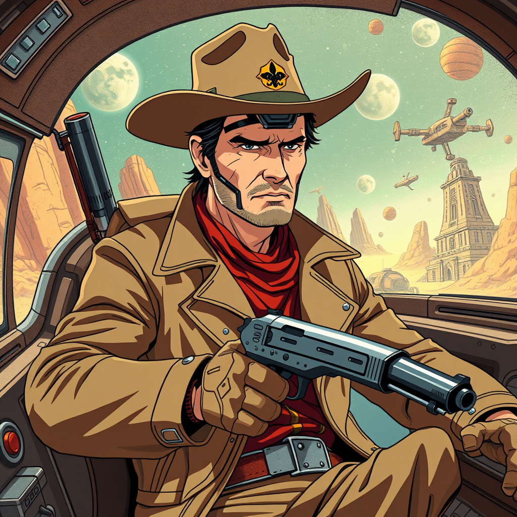 John Wayne reimagined as an anime space cowboy, blending his iconic rugged charm with the sleek style of Cowboy Bebop and Trigun, set in a vibrant space western universe; he navigates through the cosmos in a dusty, futuristic spacecraft, sporting a classic cowboy hat and long duster coat, with cybernetic enhancements; his loyal AI sidekick imbued with a quirky personality; planets with wild west-inspired outposts and bustling space saloons; intense standoffs using laser revolvers and thrilling space chases amidst asteroid fields; a blend of old-school western grit and futuristic sci-fi elements, crafting an adventurous and nostalgic space odyssey.