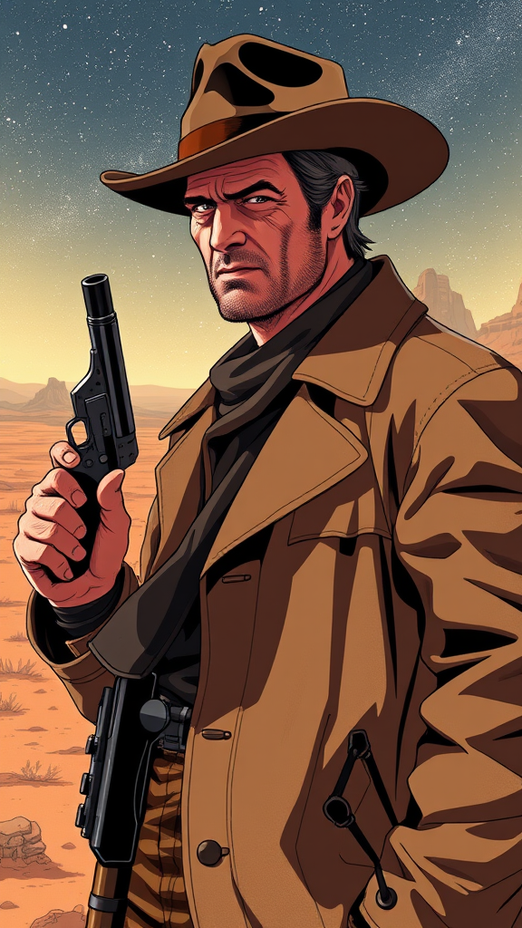 John Wayne reimagined as an anime space cowboy, blending the rugged charisma of a classic Western hero with the futuristic edge of Cowboy Bebop or Trigun. Picture him in a universe where dusty frontier planets meet high-tech starships, donning a weathered duster coat and a wide-brimmed hat. His trusty laser revolver holstered at his side, eyes scanning the horizon for bounties. A backdrop of twinkling stars and barren desert landscapes, capturing the essence of a space western infused with sci-fi elements and adventure.