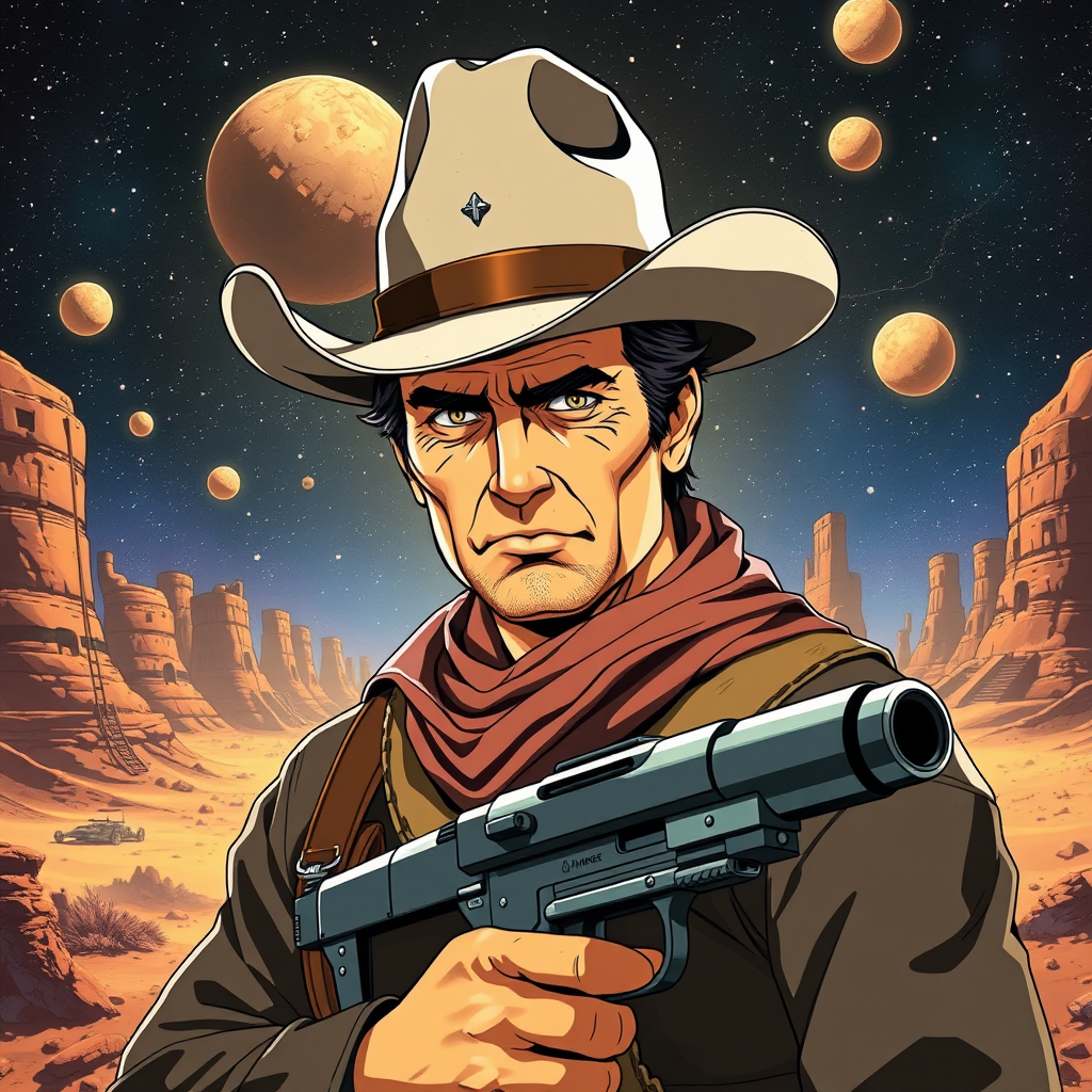 John Wayne reimagined as an anime space cowboy, channeling the essence of Cowboy Bebop and Trigun, set in a vast starry frontier. Picture him with a vintage cowboy hat, trusty blaster by his side, rugged attire with a futuristic twist, and a spaceship reminiscent of an old western stallion. The backdrop features a wild west in space with bustling asteroid outposts and dusty alien planets, blending the timeless rugged charm of westerns with sleek, high-tech sci-fi elements.