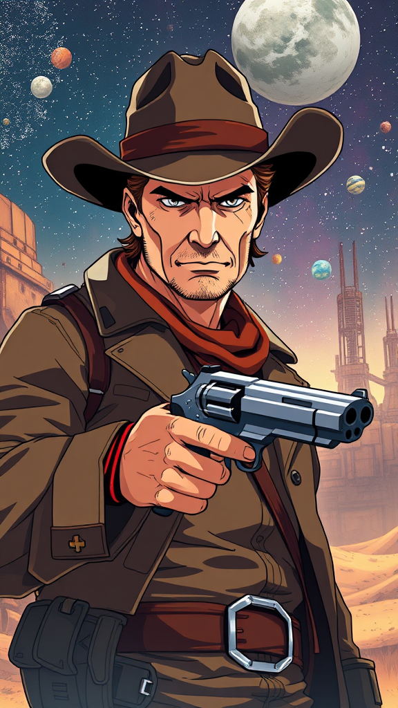 John Wayne reimagined as an anime space cowboy, traversing the galaxy in a futuristic yet gritty universe reminiscent of Cowboy Bebop or Trigun. He wears a blend of classic western attire and sleek sci-fi gear, complete with a wide-brimmed hat and a laser revolver. His rugged charm and stoic demeanor embody a seasoned gunslinger navigating the dusty outposts of distant planets. The backdrop features a blend of vast, starry skies and rusty space stations, combining the untamed frontier with advanced technology in a vibrant anime style.