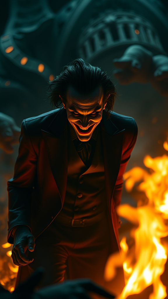 Joker emerging from the embers, glimmers of light, 8k resolution, high definition, sculpted illumination, intense contrast, rich depth of field, ultra-detailed, hyper-realistic cinematography, exaggerated proportions, immersive first-person perspective, intricate details, shadowy atmosphere, bokeh effect, epic composition, stunningly realistic textures, 2:3 aspect ratio.