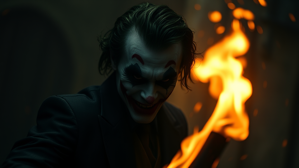 Joker emerging from the shadows, embers floating in the air, 8k resolution, high definition, intricate contour lighting, stark contrast, enhanced depth of field, ultra-detailed, photorealistic style, cinematic atmosphere, grandiose scale, viewed from a first-person perspective, rich in detail, moody ambiance, subtle bokeh effect, dramatic composition, superbly realistic textures, aspect ratio 2:3.