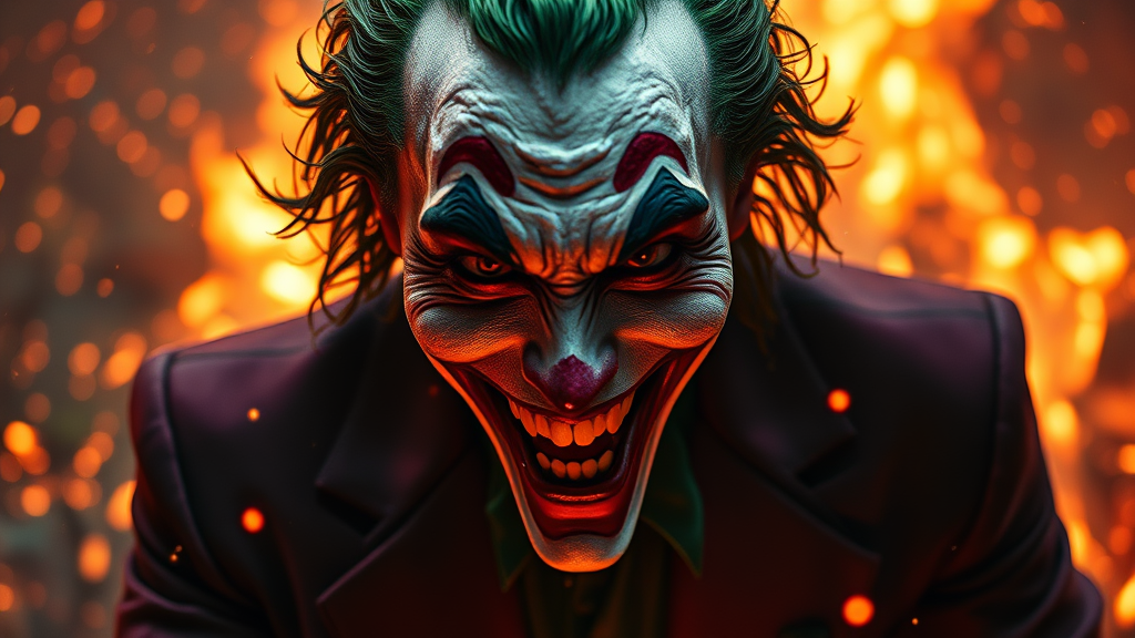Joker reborn from the embers, crackling sparks, 8k resolution, high-definition clarity, intense contour lighting, extreme contrast, cinematic depth of field, intricate ultra detailing, photorealistic cinematography, towering presence, first-person perspective, richly detailed, shadowy ambiance, dramatic bokeh effect, monumental frame, hyper-realistic textures with an epic and dark tone.