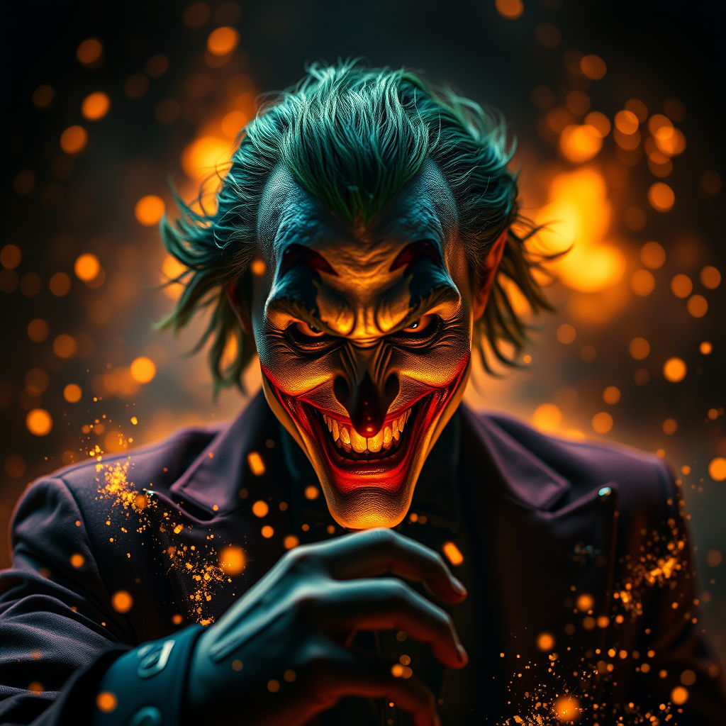 Joker reborn from the embers, glowing sparks all around, 8k resolution, HD quality, dramatic contour lighting, striking high contrast, rich depth of field, ultra-detailed, photorealistic imagery, cinematic style, enlarged proportions, seen from a first-person perspective, intricately detailed, dark and moody atmosphere, soft bokeh effects, capturing an epic moment, hyper-realistic textures, towering in presence, immersive frame, intense and vivid visual experience --ar 2:3.