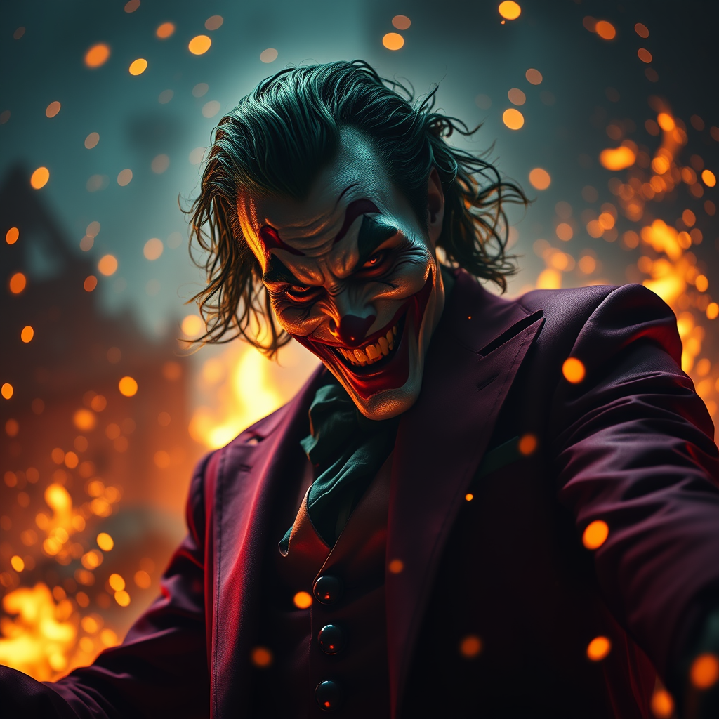 Joker reborn from the embers, surrounded by glowing sparks, captured in stunning 8k, high-definition with dramatic contour lighting, vibrant high contrast, and immersive depth of field. The scene is rendered with ultra-realistic detail and a cinematic touch, emphasizing the enormity of his presence through gigantism, viewed from a first-person perspective. The frame is filled with intricate details and a dark, moody tone, complemented by a captivating bokeh effect. An epic composition with super realistic textures -- aspect ratio 2:3.