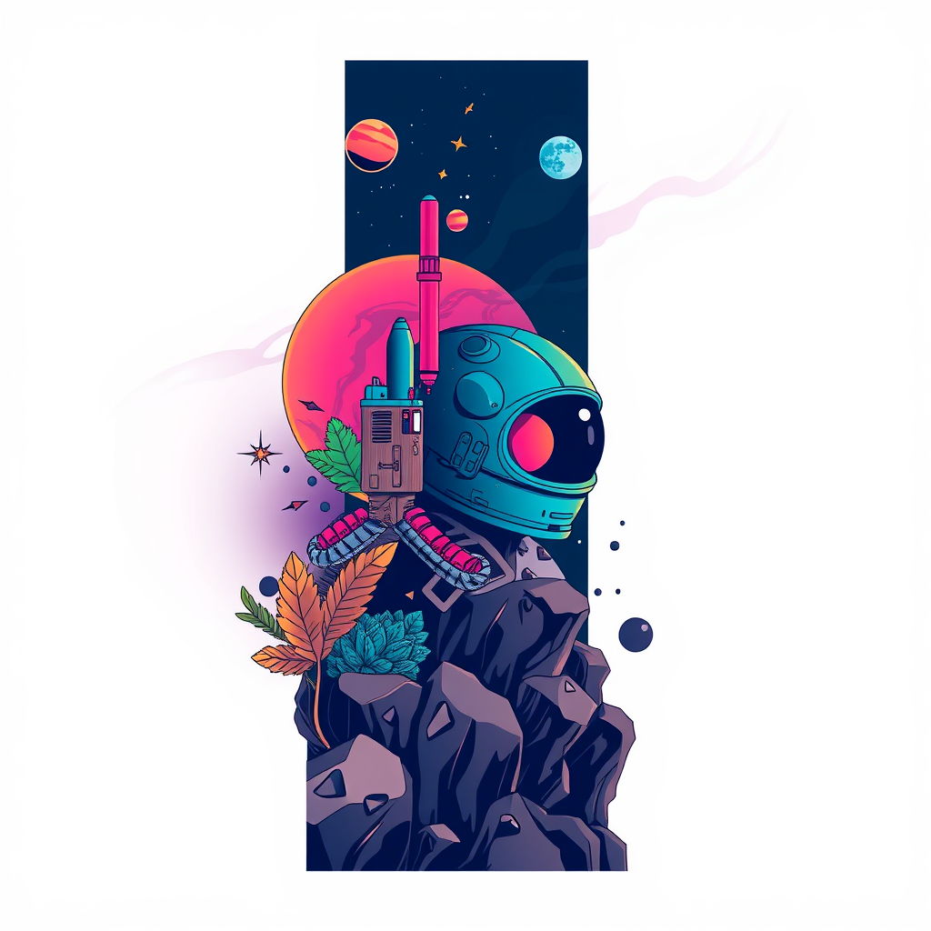 jonah m inspired art design, space-themed with crisp neo-pop illustrations, nature-inspired elements, smokey backdrop, vibrant colors, in the style reminiscent of alan bean, showcasing dynamic balance, vector style for t-shirts, composed within an upright rectangular shape, contour detailing, set against a white background, niji 5 influence and a creativity level of 750