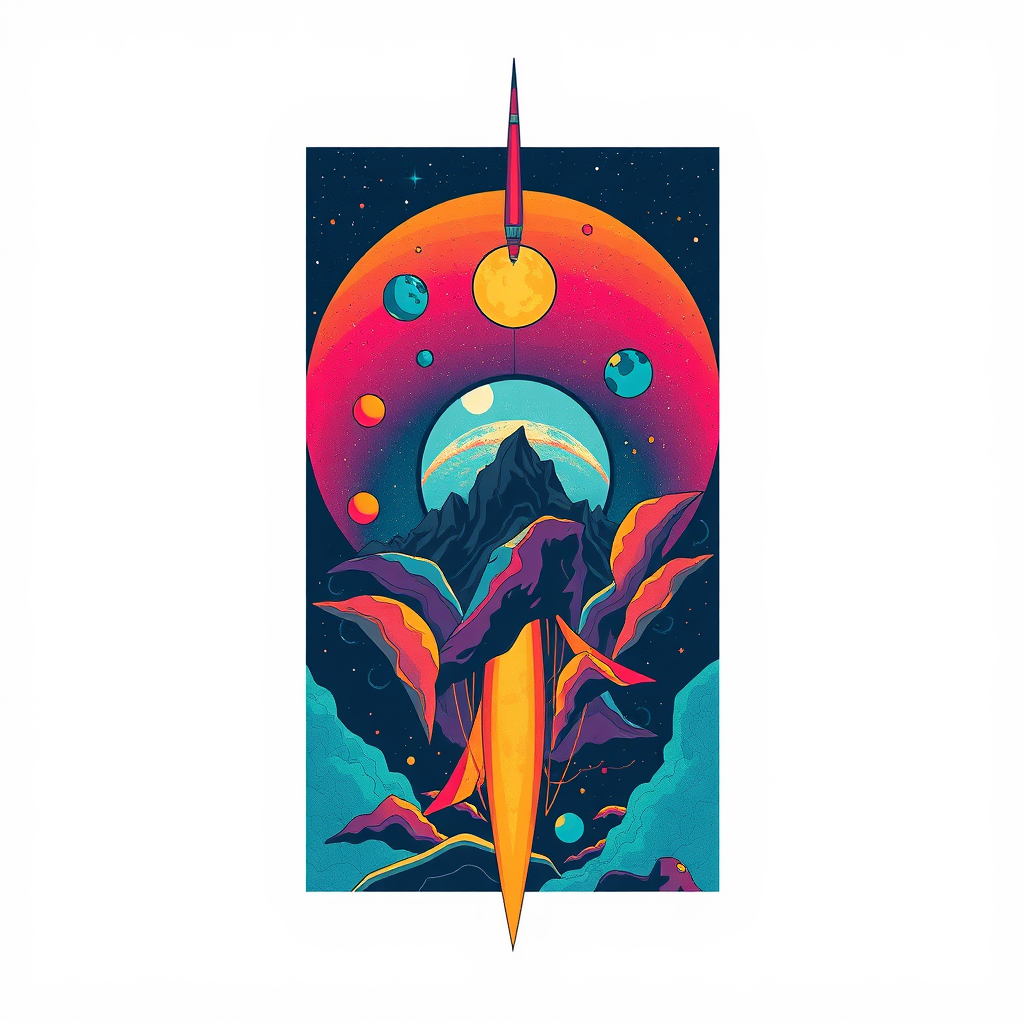 jonah m inspired design, space art style with crisp neo-pop elements, a touch of nature painter flair, smokey background, vibrant and dynamic illustrations reminiscent of alan bean, harmonious balance, suitable for tshirt vector, contained within an upright rectangle, bold contours, set against a white background