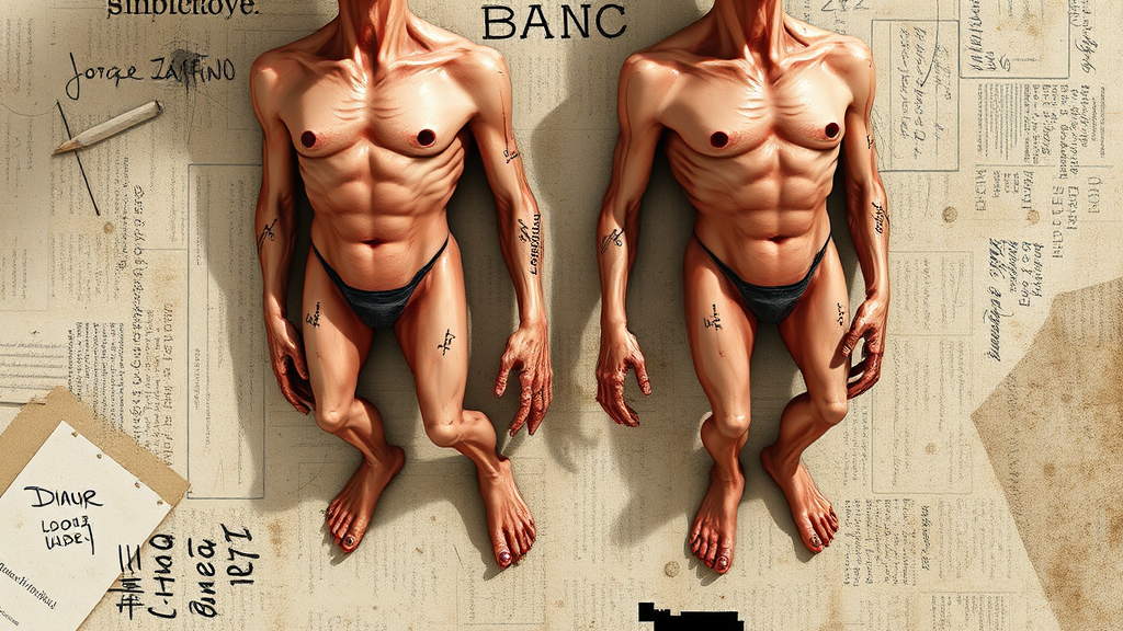 Jorge Zaffino-inspired, low-resolution, indistinct, plastic-like texture, grainy surface, duplicated elements, awkwardly rendered anatomy, disproportionate limbs, random text and markings, visible name or signature, watermark or logo present, illegible autograph, trademark visible, low-quality, jpeg distortion, partially cut off, obscured or censored elements, distorted body and facial features, noticeable deformities.