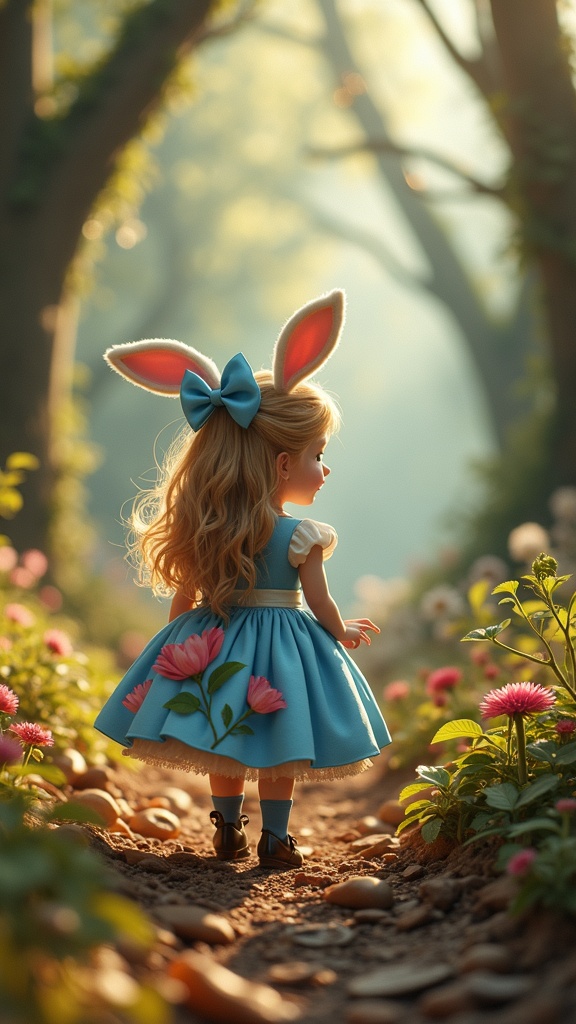 A whimsical journey inspired by Alice in Wonderland, featuring enchanting magic and fairy tales; an awe-inspiring 3D render reminiscent of Unreal Engine and Octane Render, capturing captivating cuteness and stunning beauty; masterfully enhanced through Adobe Photoshop to create an extraordinary visual experience.