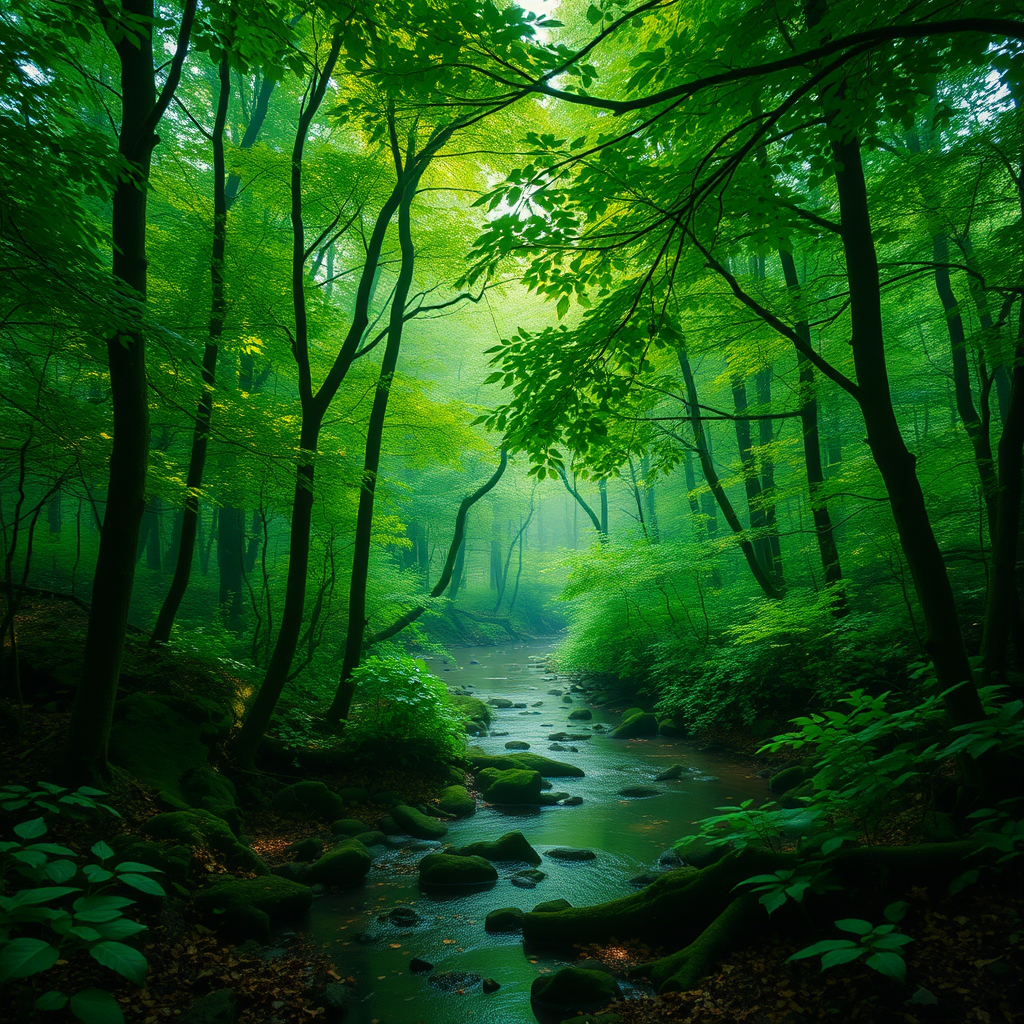 Journey into the heart of a luminous forest where every leaf glows with a soft, ethereal light, and the air is filled with the soothing sounds of a hidden creek, inviting exploration and discovery.