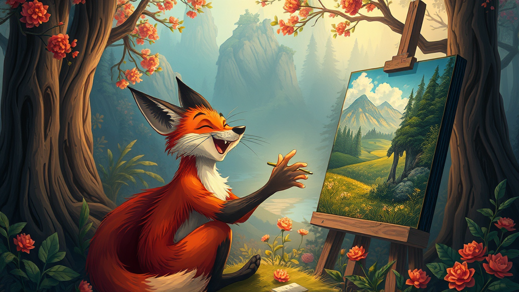 Joyful and energetic fox creating an exquisite landscape painting, featuring vivid hues and elaborate details, inspired by Studio Ghibli and Bastien Lecouffe-Deharme, within an enchanting, whimsical forest setting, fantasy illustration, capturing a sense of wonder and creativity.