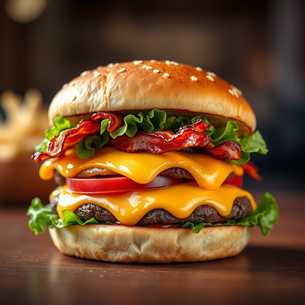 Juicy burger with crispy bacon, fresh lettuce, ripe tomato, and melted cheese | high-definition promotional shot | vibrant colors | ultimate render | irresistibly delicious