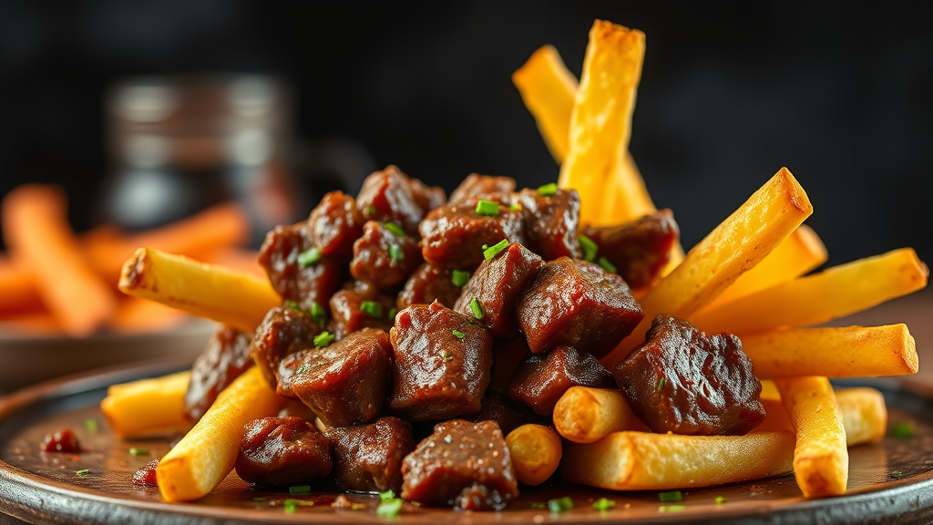 Juicy fries crafted from succulent beef with a rich, smoky essence in the background.