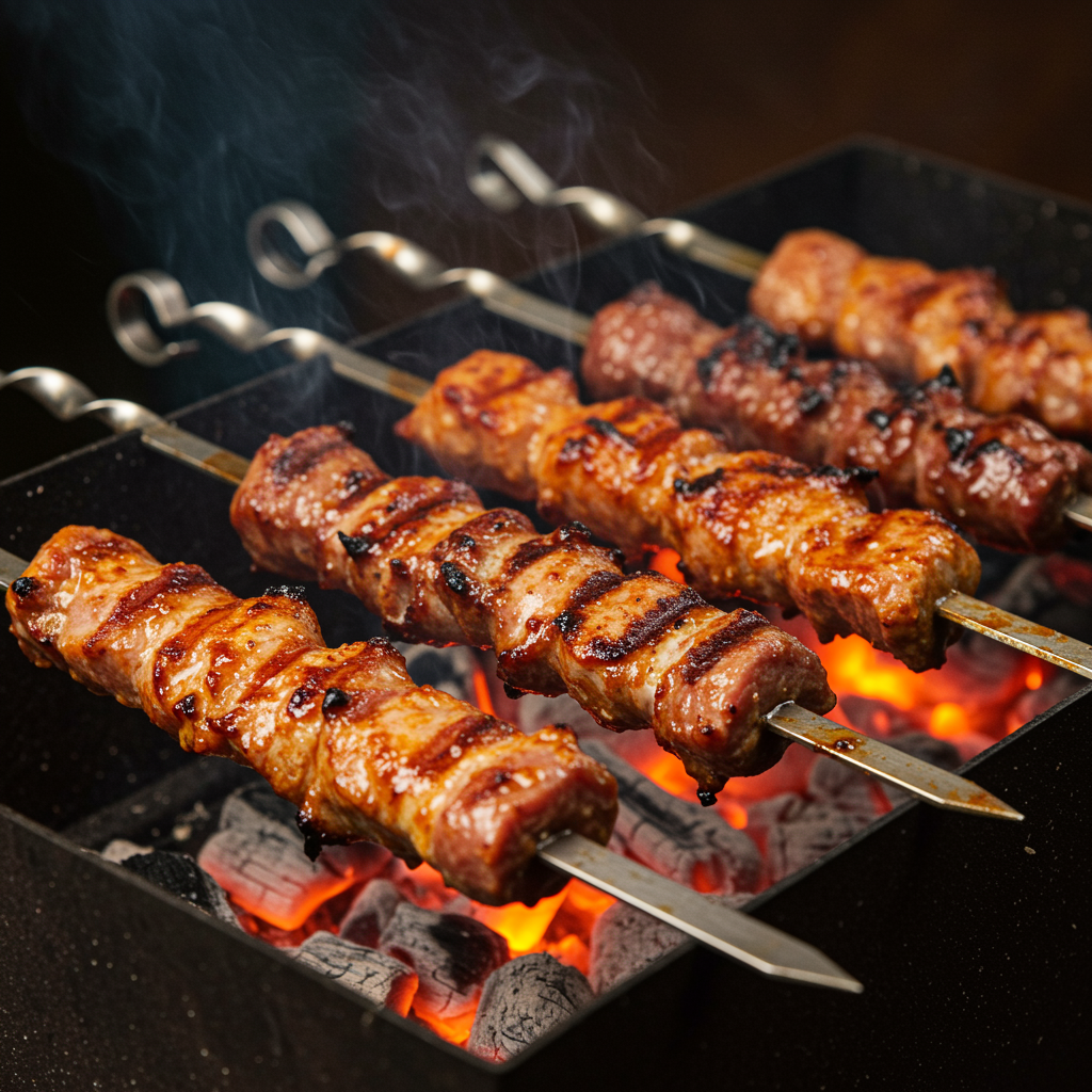 Juicy marinated meats sizzle on skewers over a fiery barbecue, surrounded by glowing coals and flickering flames. The scene captures the tantalizing aroma and savory textures, with each skewer richly glazed and caramelized to perfection. Bathed in warm, inviting light, the setting highlights the intricate details of the charred edges and succulent juices, creating an irresistible, mouth-watering allure.