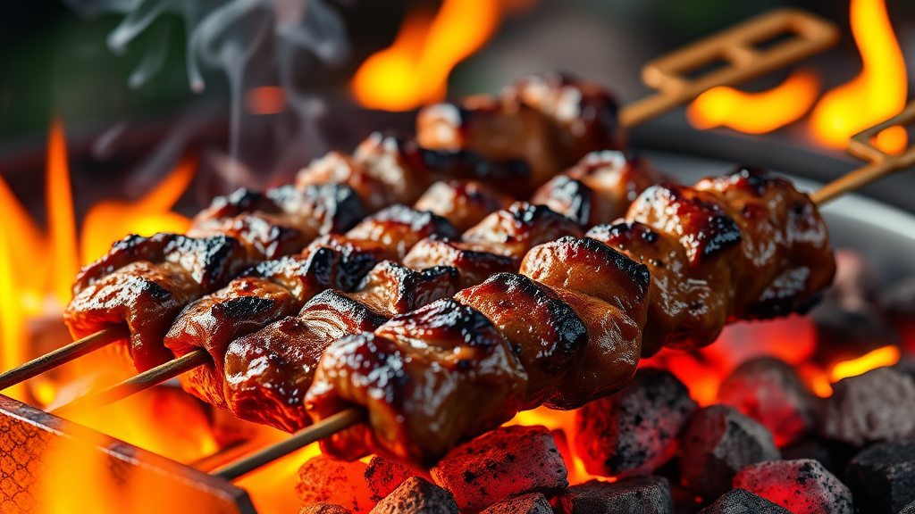 Juicy, perfectly charred skewers of meat sizzle on a barbecue grill, surrounded by glowing hot coals and flickering orange flames. The meat glistens with savory juices, capturing every intricate detail in a highly realistic food photography style, as subtle wisps of smoke rise, enhancing the delicious scene with an irresistible aroma.