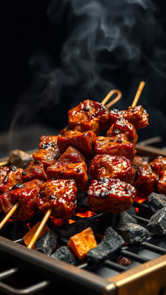 Juicy, perfectly marinated meat skewers sizzle atop a barbecue grill, their succulent aroma mingling with the smoke from smoldering hot coals, as gentle tongues of flame lick the edges. The scene captures the essence of mouth-watering perfection, with each piece of meat glistening under a studio light that enhances its rich texture and color. The grill's metallic surface adds a contrasting sleekness, complementing the rustic appeal of the skewers, making it a feast for the eyes and the palate.