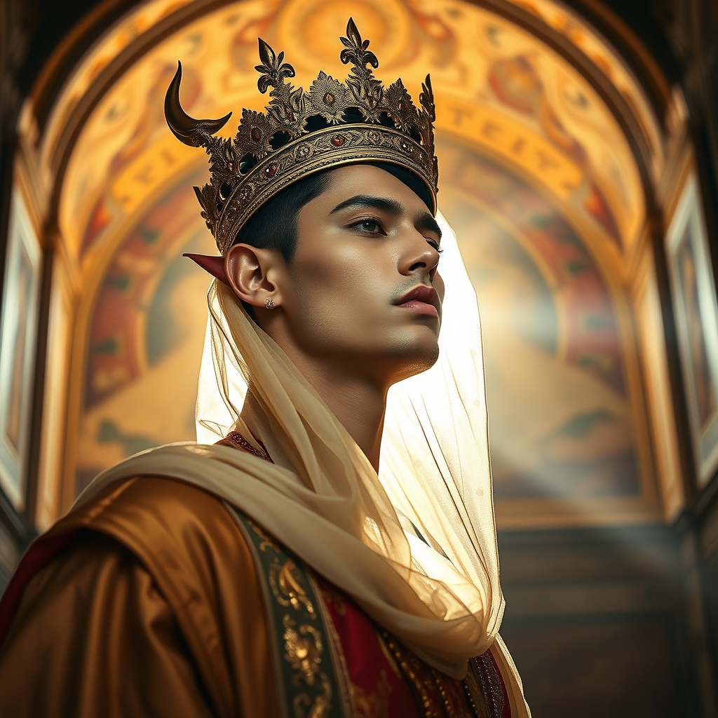 Justiniano I stands like a devilish Instagram model in the church hall, gently kissing the glowing sun. Behind him is an intricate mosaic fresco. He wears luxurious clothes adorned with a golden crown, enhanced by bold, oriental masculine makeup. A delicate fabric veil adds to his allure. Employ the rule of thirds to highlight the dynamic curves, lines, and intriguing shapes of the scene, with emotion taking precedence over composition. Captured by a renowned fashion photographer, this image focuses on raw style, using version 5.1 to enhance its emotive power through subtle creative modifications while maintaining the essence of the concept.