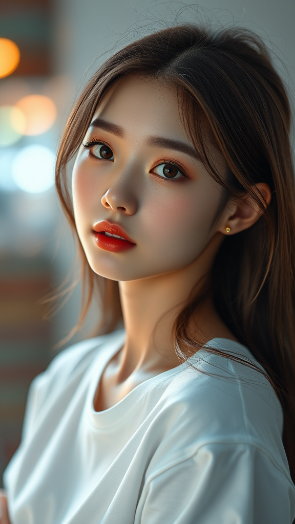 K-pop idol, captivating Korean girl, dressed in a classic white t-shirt, featuring exquisitely detailed eyes. Photorealistic high-resolution portrait with a cinematic touch, showcasing hyper-realistic digital art celebrated on Artstation. The image embodies dramatic lighting, featuring rich, lifelike skin texture rendered with precision. Captured with a Nikon D850 using Kodak Portra 400 film stock, and a lens at f1.6, the photograph highlights vibrant colors and sharp details. Enhanced by unreal engine-inspired rendering techniques, this masterpiece stands out for its vivid realism and meticulous attention to detail.