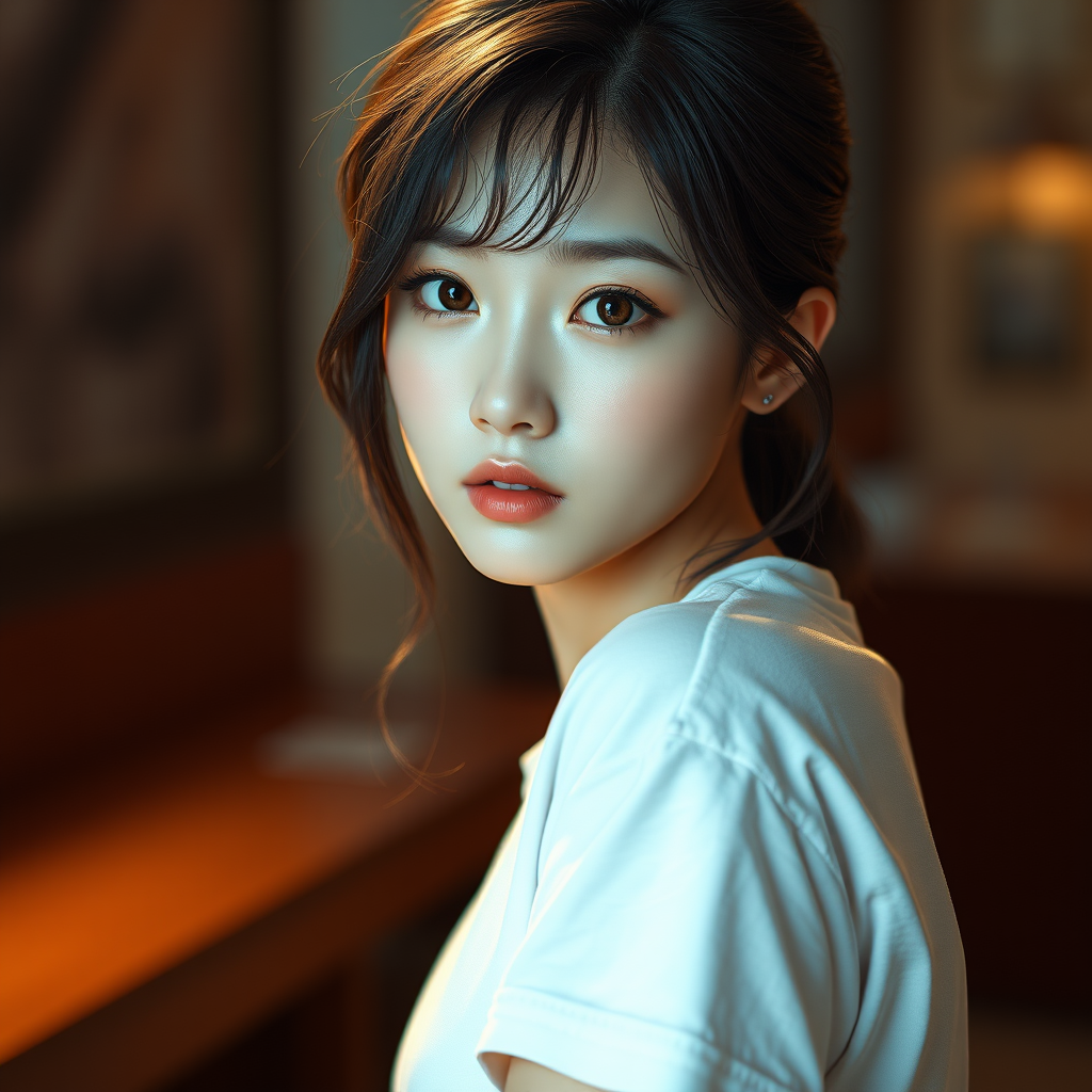 K-pop idol, stunning Korean girl, wearing a simple white t-shirt, captivating detailed eyes, petite figure, high-definition color photo, professional close-up, ultra-high resolution, highly detailed CG image suitable for 8K wallpapers, cinematic and physics-based lighting, photorealistic masterpiece with exceptional realism and high contrast, trending digital art on ArtStation, detailed realistic texture with lifelike skin, inspired by Lee Jeffries photography using a Nikon D850 and Kodak Portra 400, featuring rich colors, dramatic lighting reminiscent of Unreal Engine art, avoiding low quality elements such as poor anatomy, cropped images, or visual artifacts, emphasizing best quality and ultra-realistic depiction throughout.
