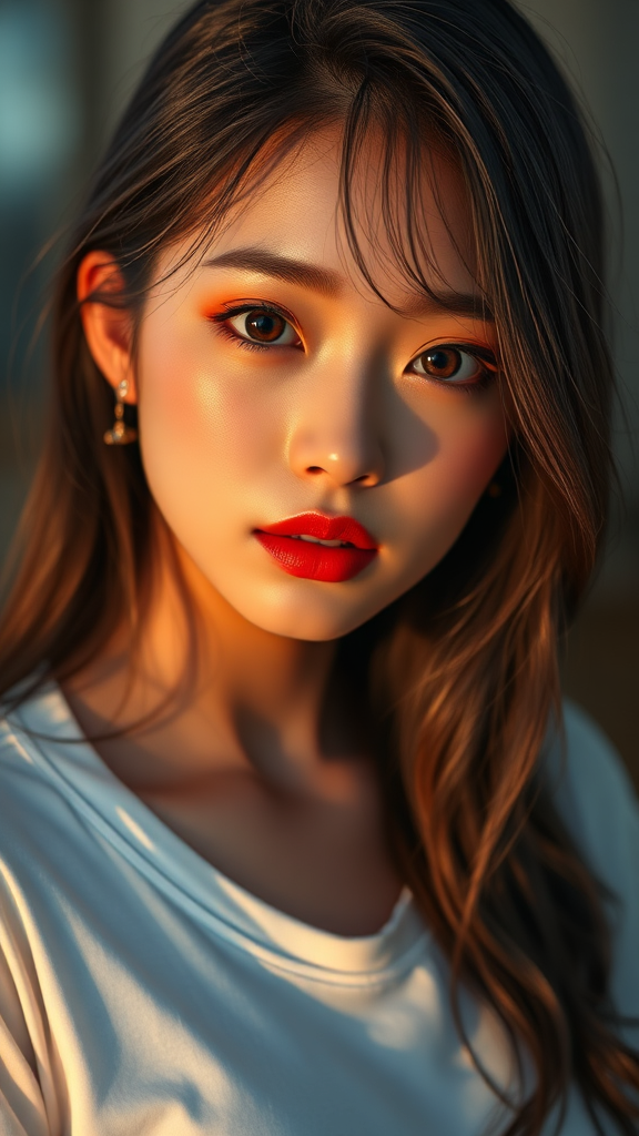 K-pop idol, stunning Korean girl, wearing a white t-shirt, captivating and detailed eyes, professional high quality photo, ultra high resolution, highly detailed CG, lifelike 8K wallpaper, cinematic lighting, photorealistic digital art with trending realism on Artstation, high contrast, detailed skin texture with rich and hyper-realistic colors, captured with a Nikon D850 using a Kodak Portra 400 camera and f/1.6 lens, employing dramatic lighting and physics-based rendering, shot with an unreal engine for enhanced realism, exhibiting the best quality in a photogenic manner.