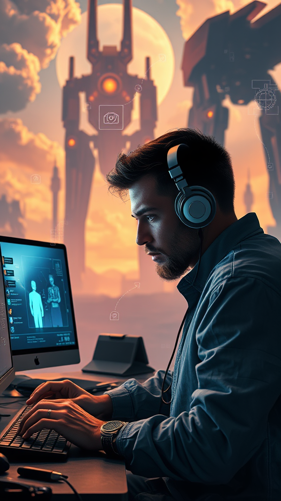Kaleb, deeply engrossed in his work, focused intently on crafting an innovative Discord bot, surrounded by the soft glow of multiple screens. The scene unfolds against a backdrop reminiscent of a Stalenhag painting, featuring towering, surreal machines and vast, ethereal landscapes. The setting is captured in stunning 8k resolution with HDR quality, highlighting the intricate details of Kaleb's tech-filled workspace. His posture exudes determination and creativity, as digital blueprints and algorithms hover in augmented reality around him, showcasing the captivating synergy between man and machine. This concept art is crafted with an ArtStation level of detail, perfectly balancing the futuristic and the artistic.