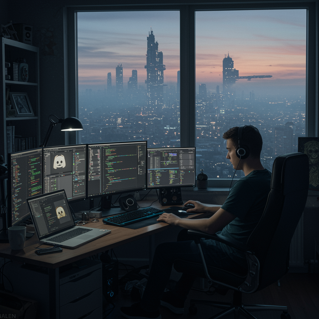 Kaleb, immersed in his digital landscape, sat at his cluttered desk, carefully designing an innovative Discord bot. The room was bathed in the glow of multiple monitors displaying lines of intricate code. Outside his window, a sprawling, futuristic cityscape reminiscent of Simon Stalenhag's artwork stretched into the distance, enveloped in a misty twilight. The scene was captured in exquisite detail, 8k resolution, and HDR, blending the elements of technology and imagination, perfect for an ArtStation concept piece.