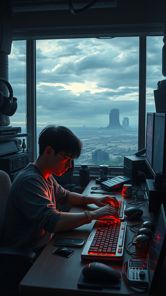 Kaleb, immersed in his digital world, furiously tapped on his keyboard, driven by the vision of a revolutionary Discord bot. The scene is captured in a Stalenhag-inspired painting, with a richly detailed 8k resolution and HDR quality. It features a dimly lit room cluttered with futuristic gadgets, casting a warm glow on Kaleb's focused expression. Outside the window, a surreal landscape with distant monolithic structures looms under an overcast sky, blending technology and nature in a harmony of concept art worthy of ArtStation. The atmosphere is one of innovation and curiosity, encapsulating the essence of Kaleb's creative journey.