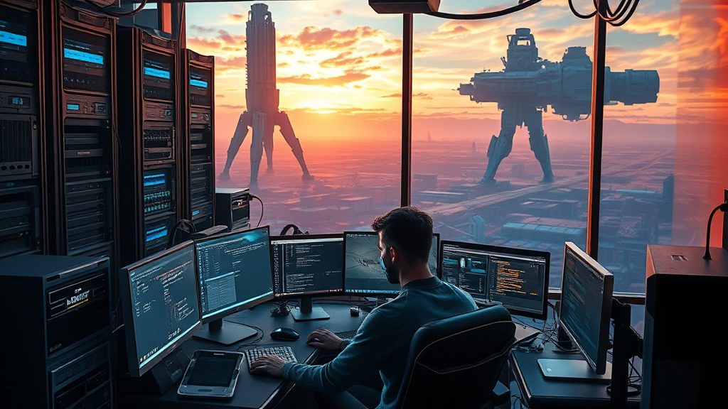Kaleb, immersed in the glow of his multiple computer screens, diligently crafted an innovative Discord bot in a scene reminiscent of a Stalenhag painting. The futuristic room was filled with an array of digital equipment, and towering server racks cast elongated shadows across the walls. Outside the window, a surreal landscape with colossal, otherworldly machinery loomed, blending seamlessly with the natural horizon. The atmosphere was richly detailed, captured in 8K resolution with vivid HDR colors, embodying the spirit of concept art and the creative energy of Artstation.