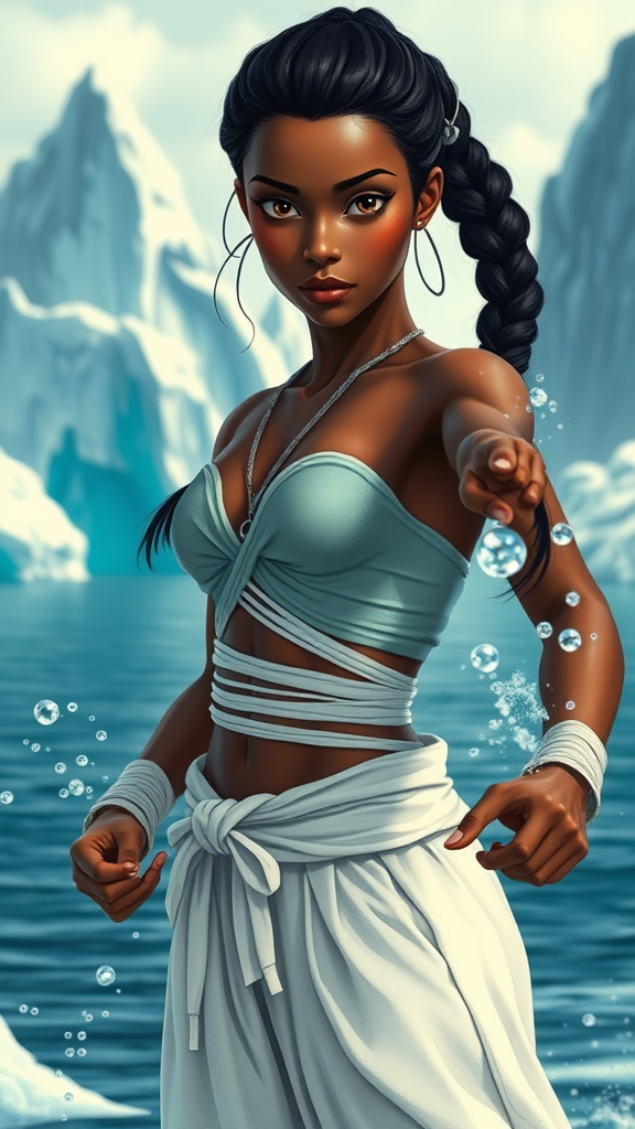 Katara, toned and with rich dark skin, stands confidently, her hair styled in a braid adorned with subtle jewelry. She gazes directly at the viewer, exuding strength and grace. Her upper body, wrapped in bandages, is detailed and dynamic, capturing her in a moment of powerful waterbending. The arctic backdrop features majestic icebergs and a serene sea, with her white, baggy pants adding a sense of fluidity. Bubbles of water dance around her hands, showcasing her mastery over the elements in this stunning setting.