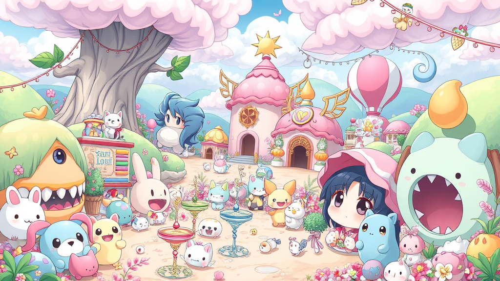 Kawaii-inspired scene featuring an endearing, brightly colored landscape with cheerful and intricately detailed elements; anime influences are evident in the wide-eyed characters, surrounded by an array of pastel-hued creatures and whimsical objects, creating an overwhelmingly cute and playful atmosphere.