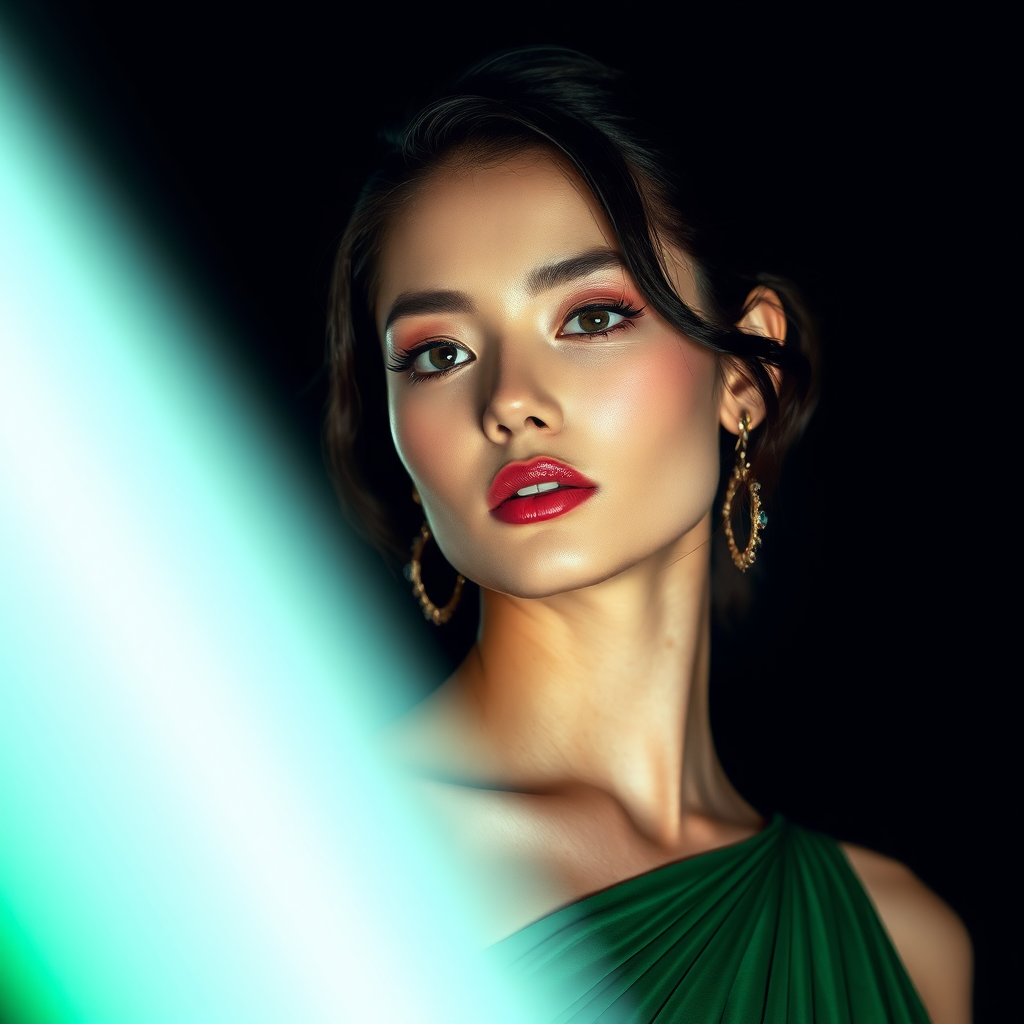 Kazakh supermodel in a bold, emerald green evening gown, introspective expression, Photorealistic, ultra high-definition textures, avant-garde fashion style, High-End Studio Lighting setup with softbox lights and hair lights, shot on 35mm film stock with Ultra Q resolution, 20 megapixels, 12K, quality config set to 6.