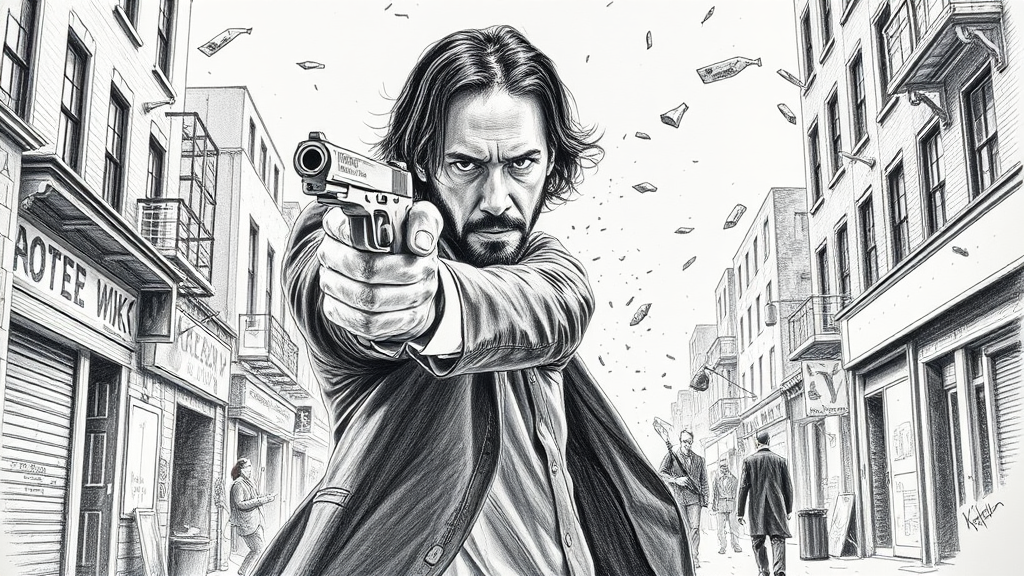 Keanu Reeves portraying John Wick in a dynamic pencil sketch, showcasing an intense action stance, gun poised and ready for action, set against a gritty urban backdrop, capturing stark contrasts and fluid motion with added elements of flying debris to accentuate the scene's energy.