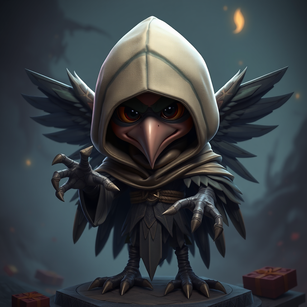 Kenku character, shrouded figure with a hood on canvas, styled in a cartoonish 3D rendering, photorealistic details, intricate feathers and talons, vibrant colors, mysterious and enchanting atmosphere, set against a dramatic backdrop with subtle fantasy elements.