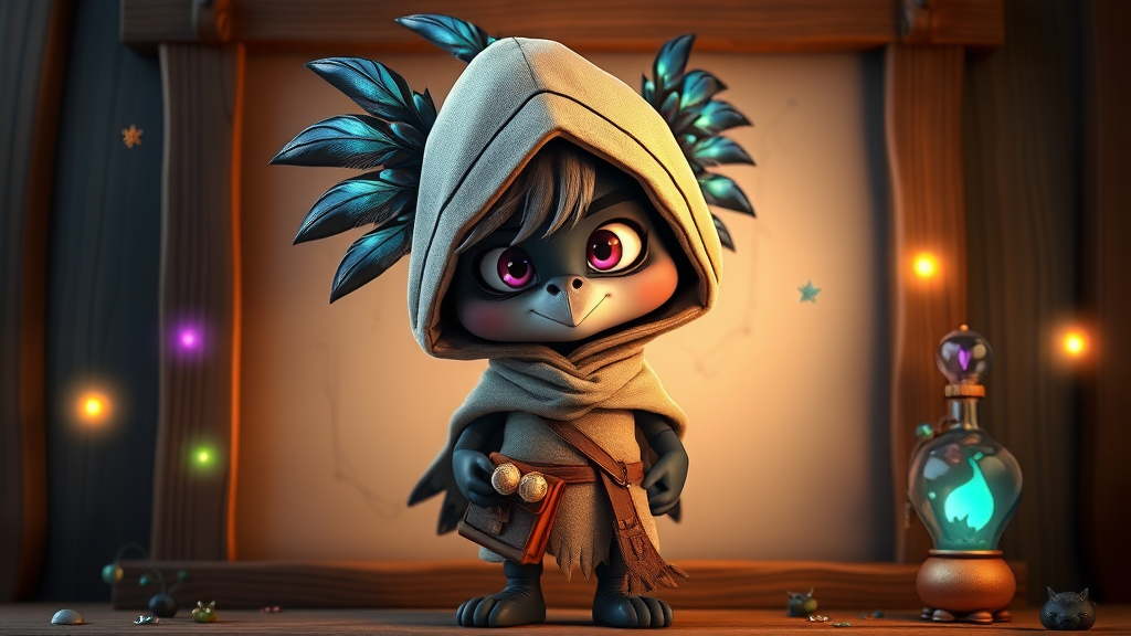 Kenku character wearing a tattered hood, standing on a wooden frame backdrop, depicted in a cartoonish yet photorealistic 3D style, with iridescent black feathers catching light, a small satchel at their side filled with scrolls, bright, mischievous eyes peeking from under the hood, surrounded by tiny enchanted trinkets floating around, casting soft, colorful glows on the character’s curious features.