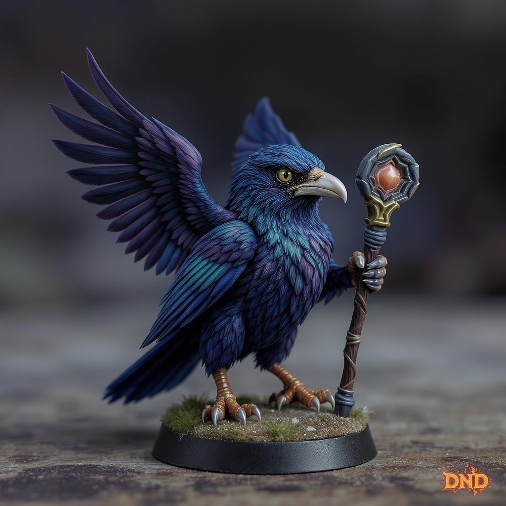 A miniature Kenku crow character, intricately detailed and perfect for a DND game, captures sharp focus with its textured feathers and expressive eyes. Bathed in twilight, its small form reveals a vibrant mix of midnight blues and deep purples, while subtle hints of gold adorn its talons and beak. The Kenku stands poised, clutching a finely crafted staff, ready for adventure, evoking the mysterious allure of this enigmatic avian race.