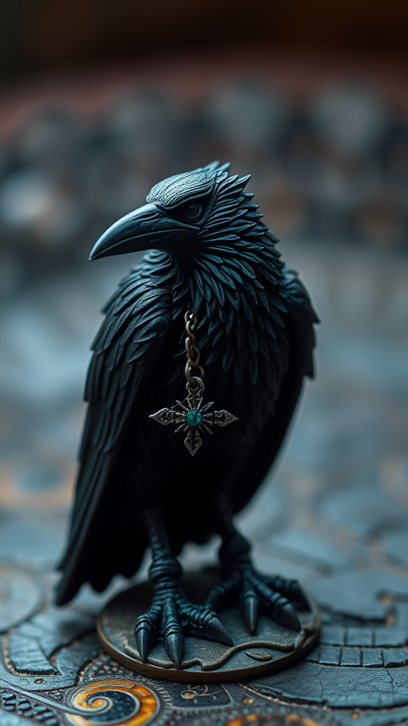 Kenku raven, tiny figurine, tabletop fantasy role-playing, intricate craftsmanship, vivid clarity, mythical ambiance