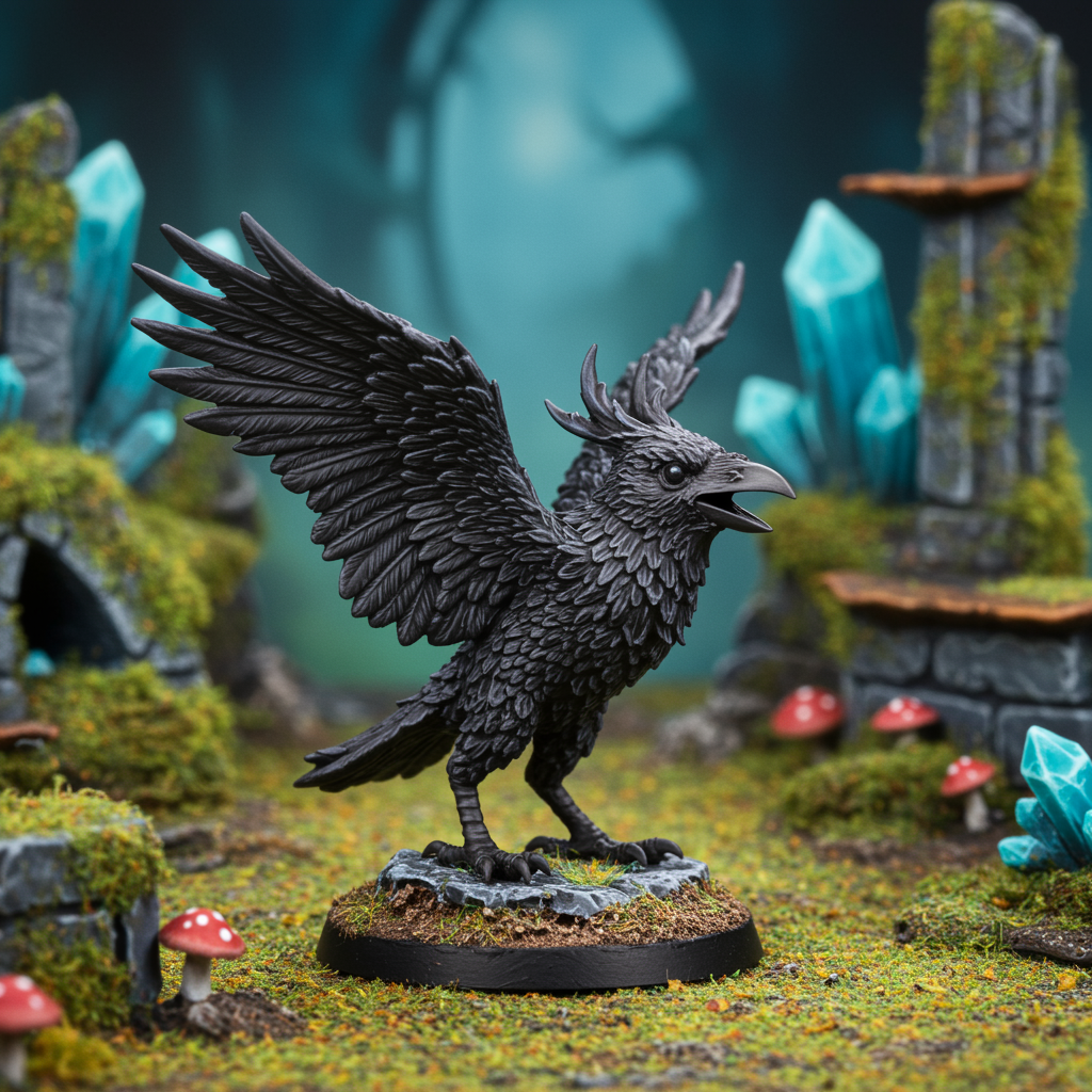 Kenku raven, tiny model, fantasy role-playing adventure, intricate details, vivid clarity, --ar 3:4, inject subtle imaginative twists, maintain essence of original theme.