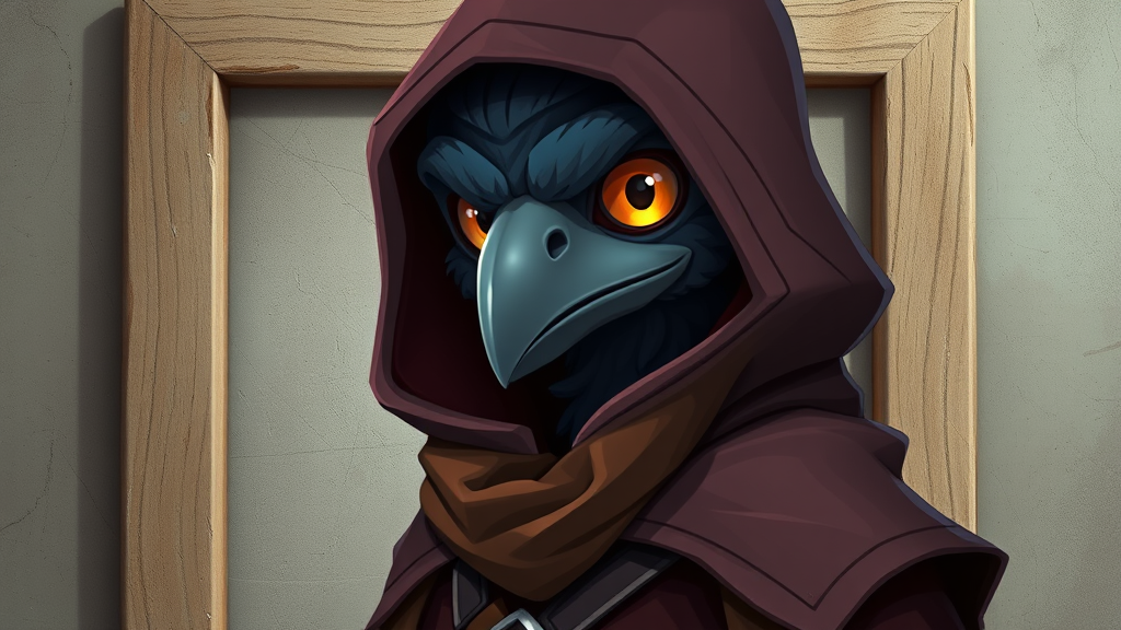 Kenku rogue wearing a tattered cloak with the hood up, set against a backdrop of a weathered canvas frame, style is a blend of cartoon and 3D photorealism, with gleaming avian eyes peering out from the shadows, intricate details in the feathers and cloak, vibrant colors mixed with subtle shading to give depth and dimension.