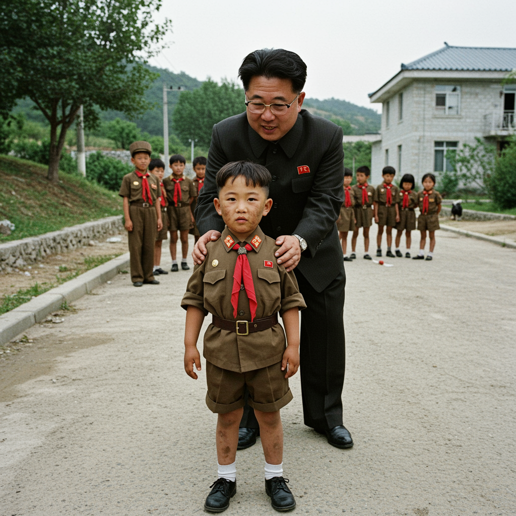 View this AI-generated image featuring a young kim jong un around 5 years old stands proudly in a north korean scout uniform his face smudged with dirt from an afternoon of playing with friends beside him his father kim jong il looks on with a gentle pride in the background a group of children also