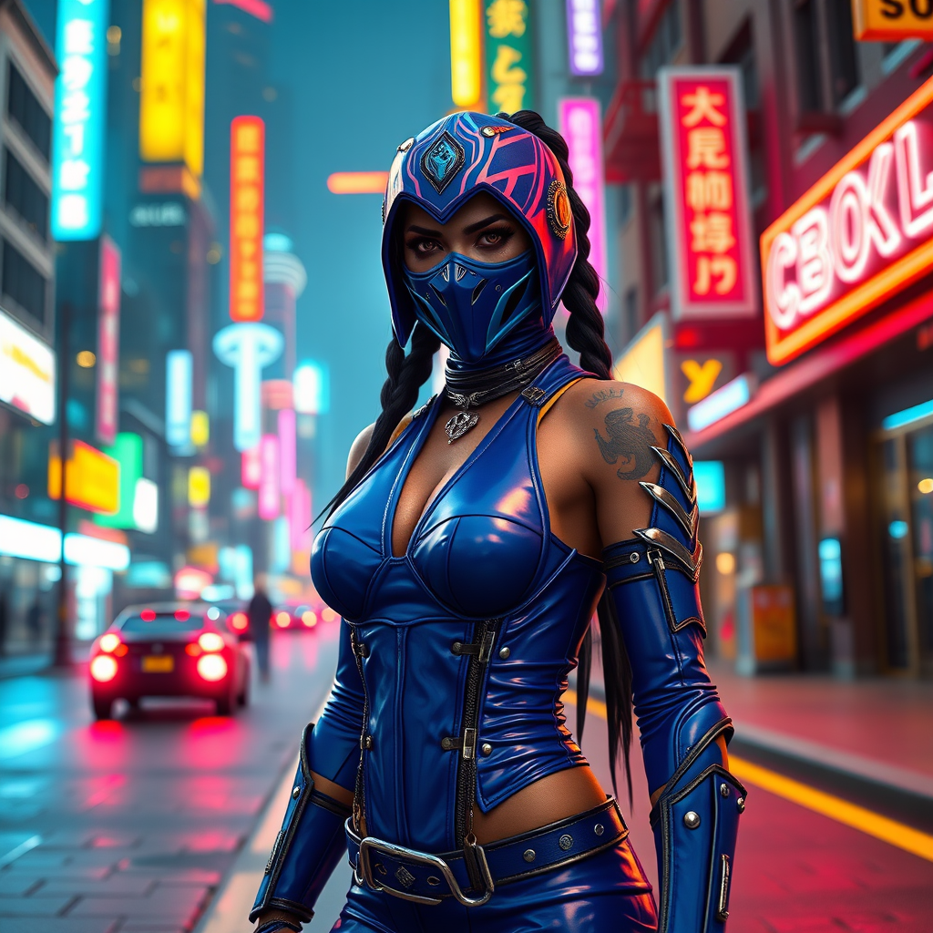 Kitana from Mortal Kombat in a cyberpunk setting, standing outdoors on a futuristic street, adorned in a royal blue outfit. The scene captures hyperrealistic and photorealistic details in 8k quality, utilizing the power of Unreal Engine and a 3D render. The background is vibrant with neon lights reflecting the expressive style and dynamic atmosphere of the cyberpunk world, enhancing the edgy, high-tech aura of the environment. The vertical aspect ratio highlights the towering cityscape and Kitana's commanding presence in this immersive, imaginative scene.
